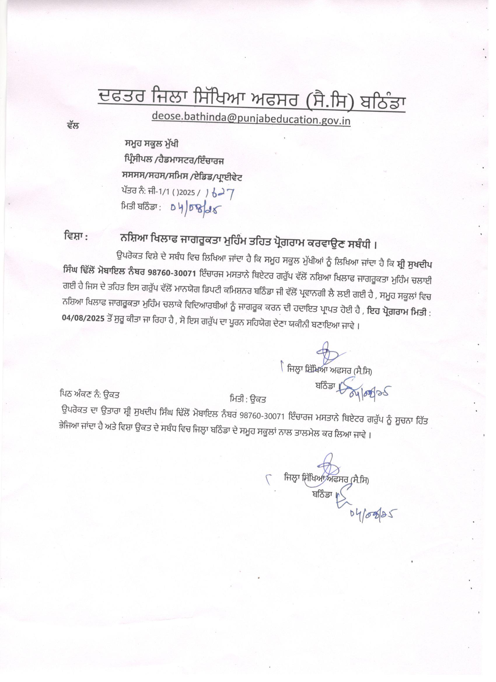 Reg. ਯੁੱਧ ਨਸ਼ਿਆਂ ਵਿਰੁੱਧ ਦੋ ਦਿਨਾਂ ਟ੍ਰੇਨਿੰਗ resource person |